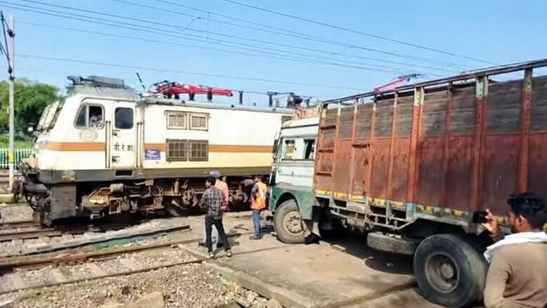 रेलवे ट्रेक पर फंसा सीमेंट से लदा ट्रक